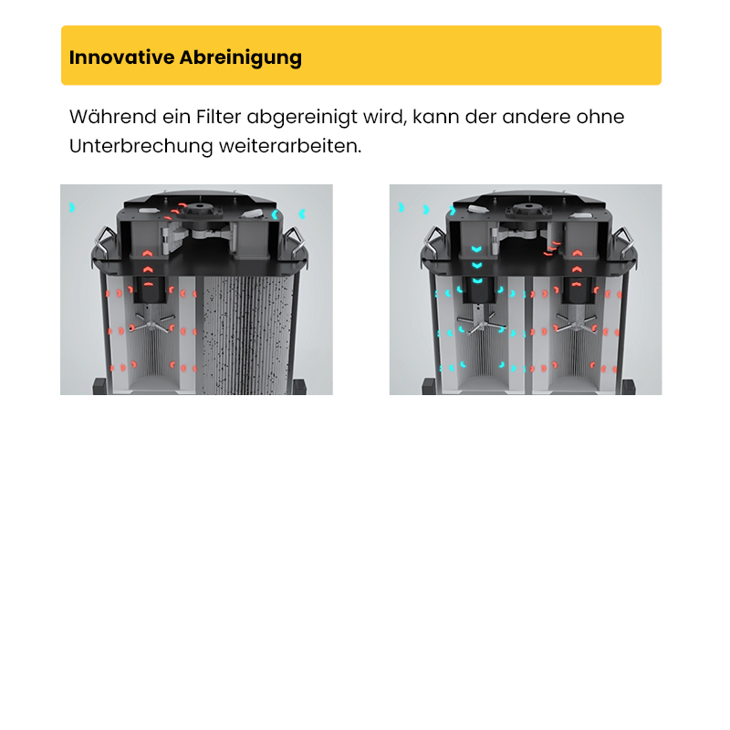 Das System steht für geringen Filterverschleiß, niedrige Betriebskosten und einen wartungsarmen Dauerbetrieb. Keine Abreinigungspausen, kein Luftkompressor, keine komplexe Elektronik – dadurch läuft die Technik konstant und zuverlässig. Die einfache Bedienung, der Verzicht auf ständigen Behältertütenwechsel sowie die robuste, langlebige Bauweise machen die Geräte besonders praxisgerecht.